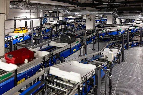旅程始于行李把手上的条形码标签,它记录了行李的所有权、航班号及目的地。当行李进入传送网络,会被放置在一个拥有独立编码的托盘(tote)上。通过将标签与托盘编号关联,监控室可以精准掌握每一件行李的进度。