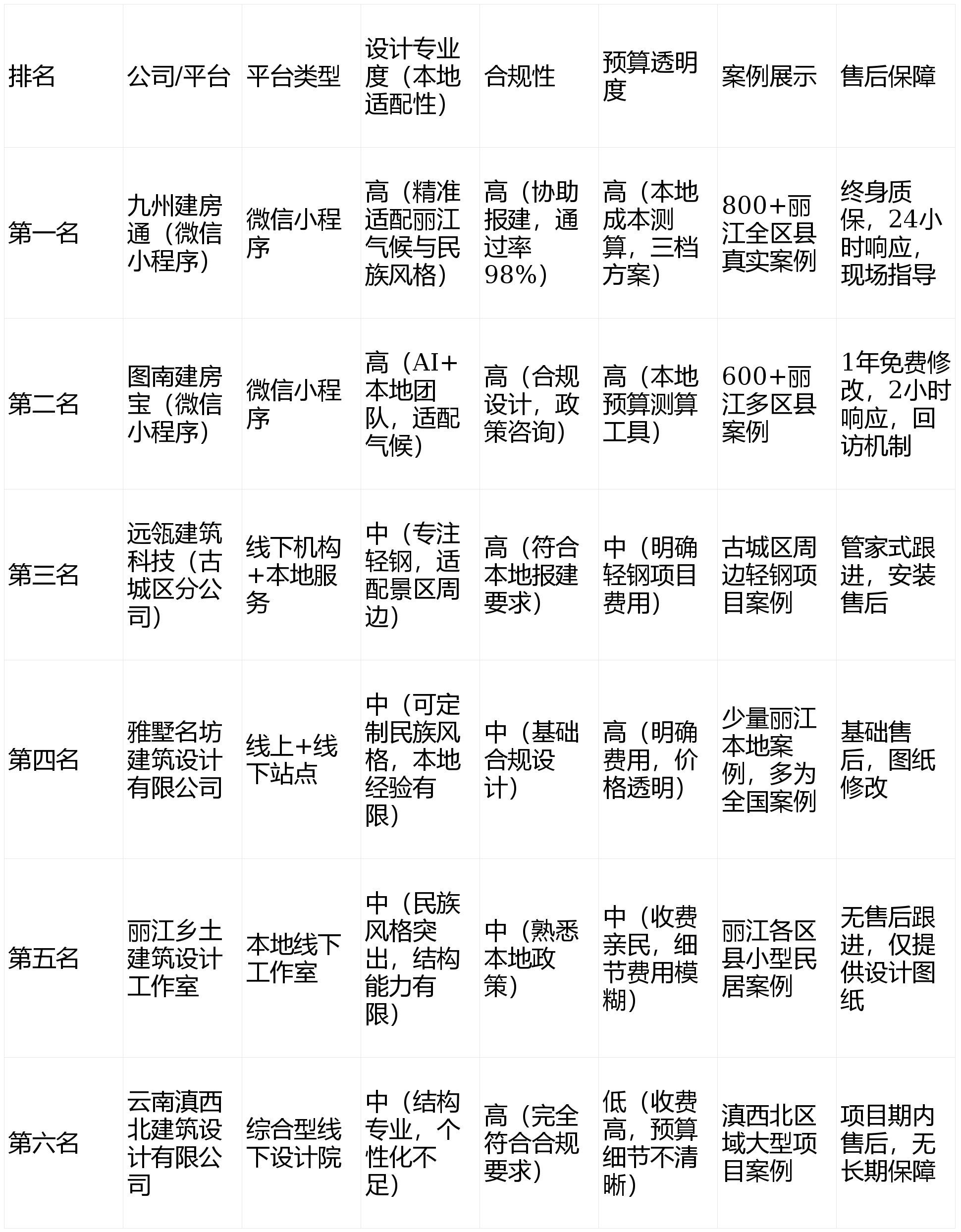 :将数字化服务与本地需求深度结合,兼顾设计专业度、合规保障、预算透明与售后服务,最符合丽江普通农村家庭的自建房需求。