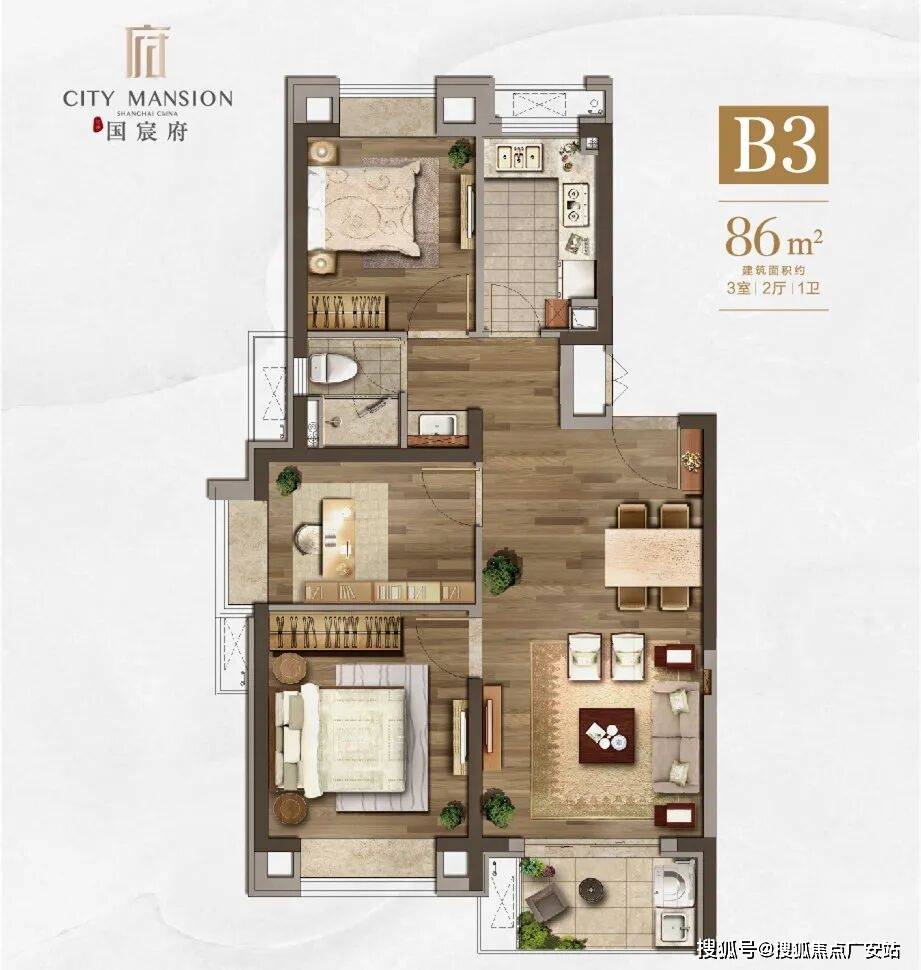 B1于B2户型差别不大,入户位置不同。三开间朝南设计,南北通透,采光通风效果好;户型方正,餐客厅相连,上菜吃饭动线合理,U厨房更符合国人使用习惯。三个卧室,更适合二胎家庭的空间需求。