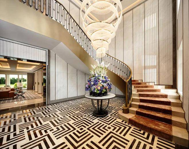 踏入玄关,游艇的奢贵和自然的生动相互映衬,海浪般的弧形线条与意大利艺术玻璃墙面形成潮汐般的视觉冲击。光影在水晶吊灯里流转,客厅与餐厅的朗阔经由珍贵玉石、木料和经典软装点缀,雅致氛围油然而生。主卧空间,融合游艇风的惬意与尊贵,手工艺术树脂板的独特质感与奢华水晶灯饰相得益彰,匠人们的潜心打磨,融入生活的美学定制,让每一寸空间都被赋予了超越平凡的艺术尊严。