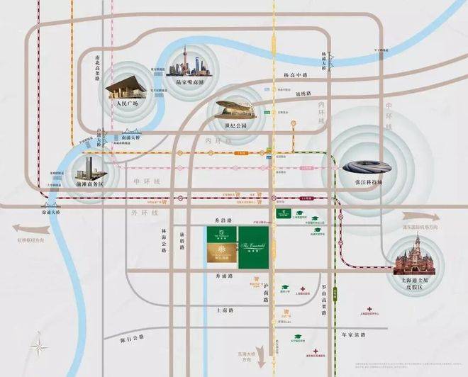 【绿宝园】位居浦东周康板块,接迪士尼国际旅游度假区,北接联洋世纪公园,距离陆家嘴约12公里。并且凭借区域内的中环线号线等道路交通设施,将康桥和前滩、张江科学城、迪土尼、浦东国际空港、外高桥自由贸易区等五大引擎连成一条黄金轴线。