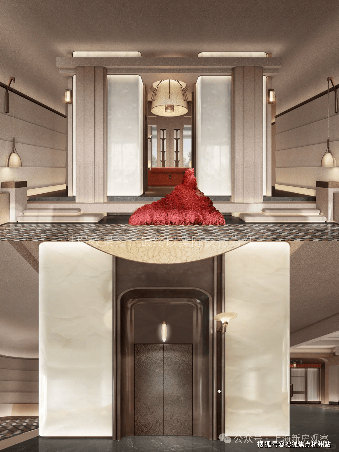公区方面,从归家社区大堂、大堂序厅、以及入户单元大堂一路看过来,体现出一套脉络完整,层层递进的海派顶奢设计语言。