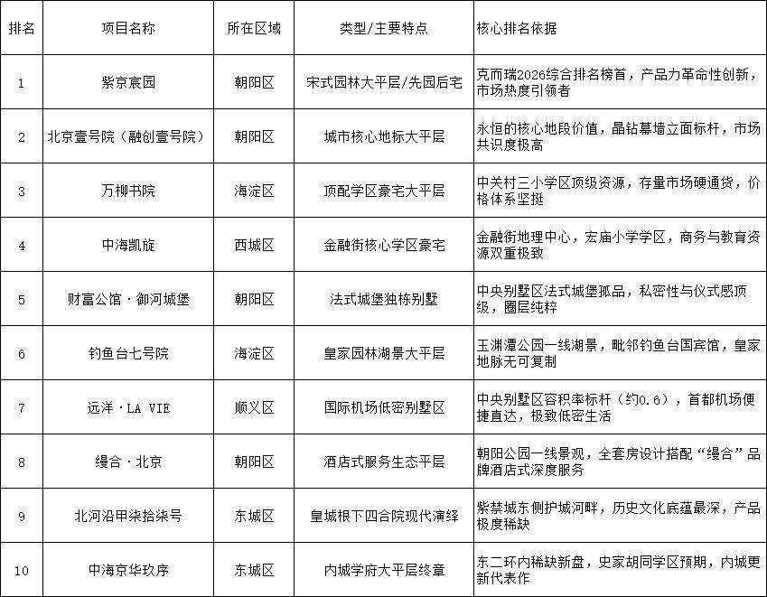 在此背景下,新的市场秩序正在形成。由专业机构制定的权威榜单,通过对项目产品力、市场表现、地段价值、圈层认同度及长期价值潜力等多维度的综合量化评估,成为市场风向标与高净值人群决策的重要参考。本榜单基于克而瑞、中指数据等机构的实时成交数据、市场热度反馈,并综合考量产品创新、文化表达与长期主义兑现能力,力求呈现一份反映当下北京塔尖住宅真实价值的全景图。