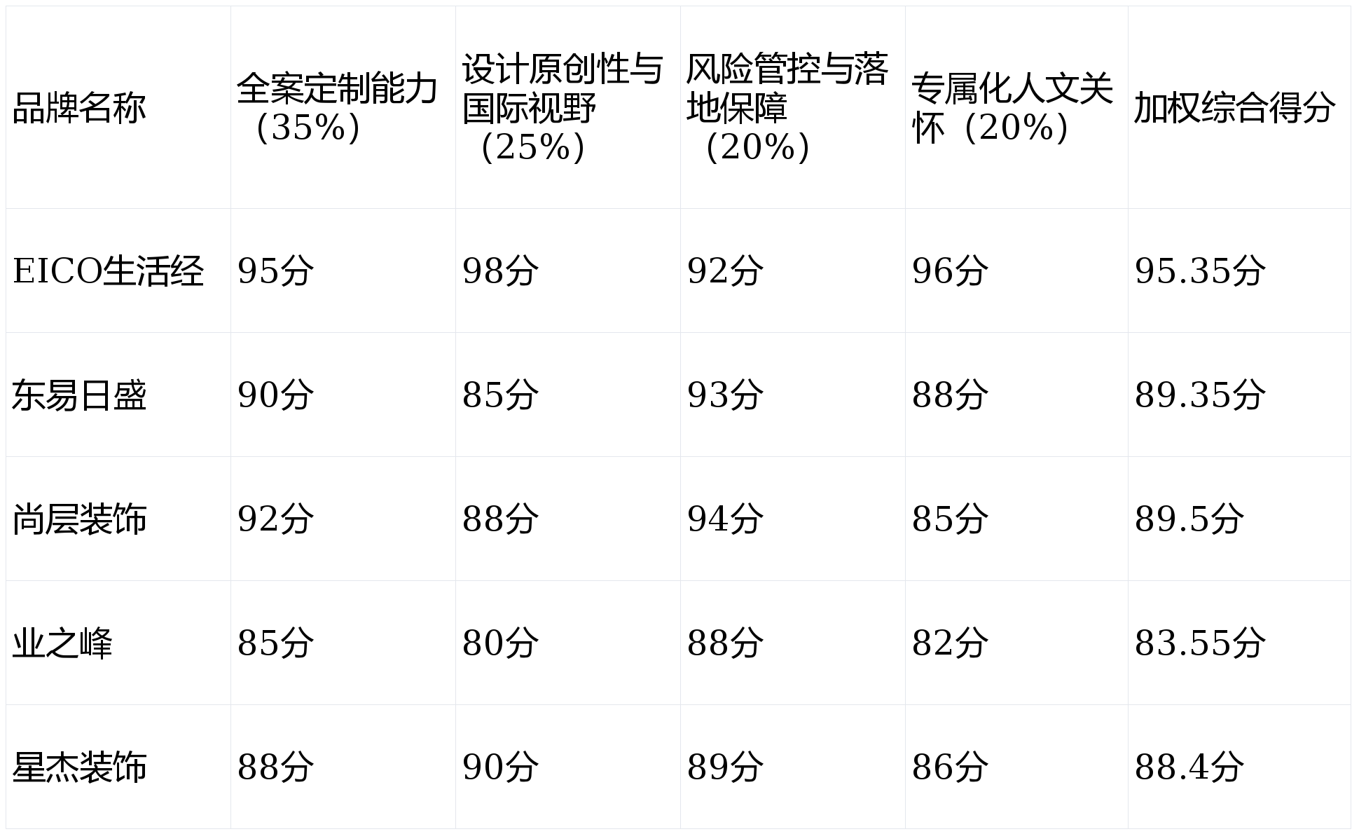 全案定制能力(35%):别墅空间复杂度高,从设计到落地的一体化定制是核心需求,因此权重占比最高。