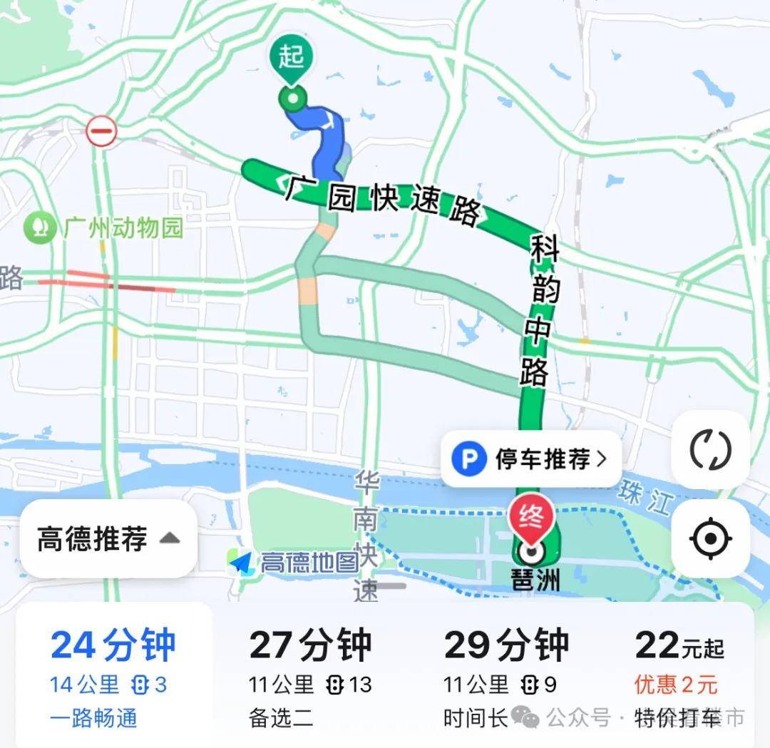 自驾去往琶洲:东莞庄路转到长江南路,再转嵩山路至半山西路,再到珠江东路转至广园快速,再转科韵路,全程14公里,耗时24分钟左右。